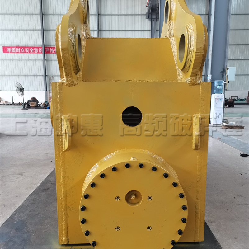 高頻破碎錘作為一種破碎工具,主要利用高速運(yùn)轉(zhuǎn)產(chǎn)生的破壞力,使目標(biāo)破壞物產(chǎn)生半液化的狀態(tài)來進(jìn)行破壞的。把挖掘機(jī)的液壓能量傳遞到液壓馬達(dá)上,馬達(dá)帶動(dòng)振動(dòng)盒內(nèi)的偏心齒輪轉(zhuǎn)動(dòng),產(chǎn)生離心力,然后通過激振盒將振動(dòng)傳到斗齒上,從而完成破碎作業(yè)的一個(gè)過程。